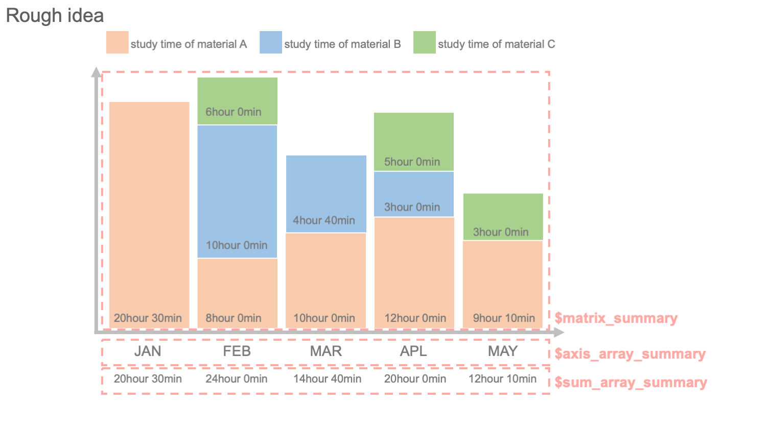 3つの連想配列では、月別、週別、日別の集計を格納しています。たとえば、$matrix_summary["month"]["MAY"]=[tA_MAY, tB_MAY, tC_MAY] では、月別集計した中で5月の学習時間を教材別に取得することとなります。* tA-MAY: 5月の教材A学習時間、 tB-MAY: 5月の教材B学習時間、 tC-MAY: 5月の教材C学習時間